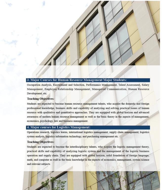 Students are expected to become human resource management talents, who acquire the domestic and foreign professional knowledge, business skills and capability of analyzing and solving practical issues of human resource with qualitative and quantitative approaches. They are equipped with global horizon and advanced awareness of modern human resource management as well as the basic theory in the aspects of management, economics, psychology, law and business management.