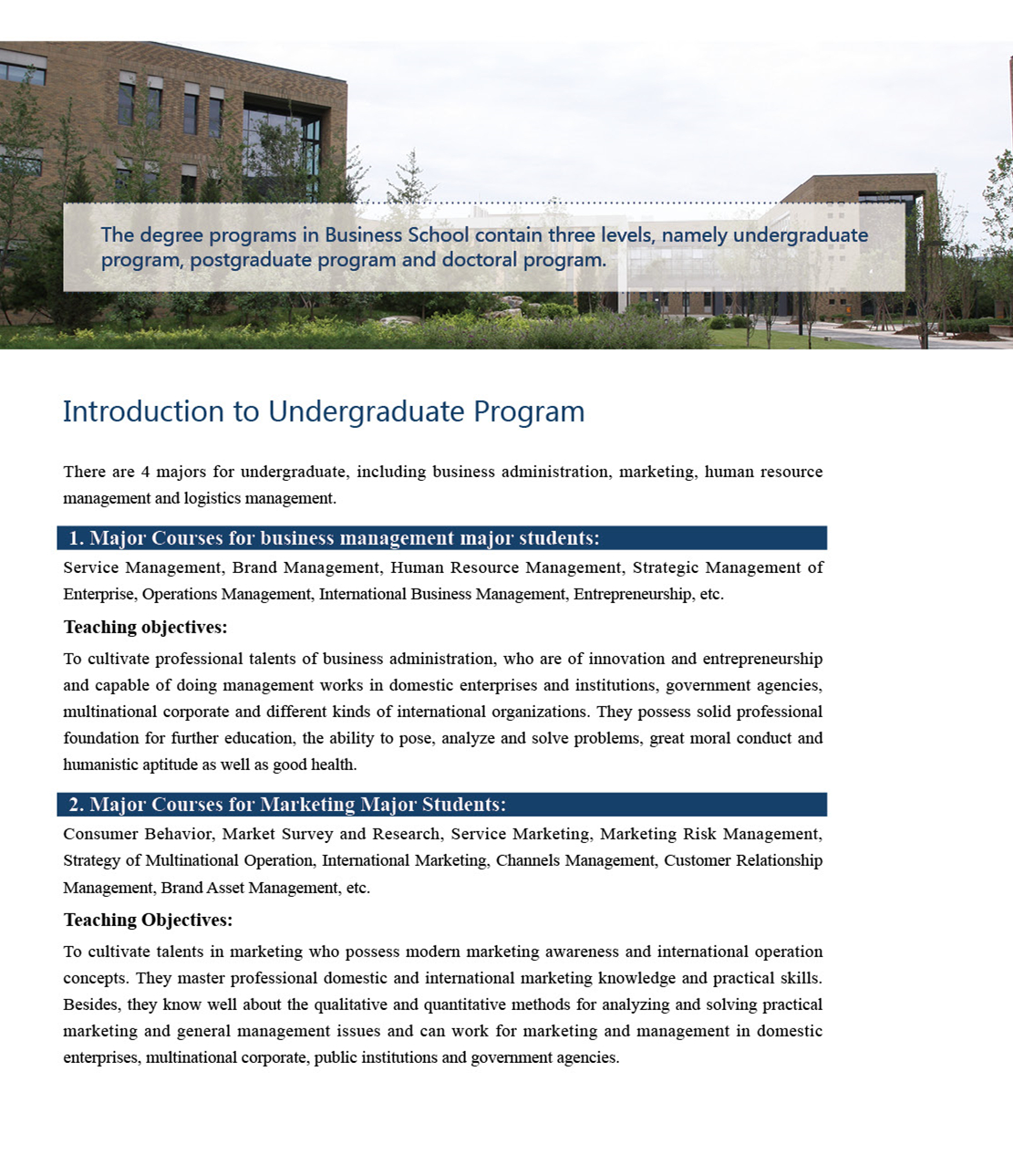 To cultivate professional talents of business administration, who are of innovation and entrepreneurship and capable of doing management works in domestic enterprises and institutions, government agencies, multinational corporate and different kinds of international organizations. They possess solid professional foundation for further education, the ability to pose, analyze and solve problems, great moral conduct and humanistic aptitude as well as good health.