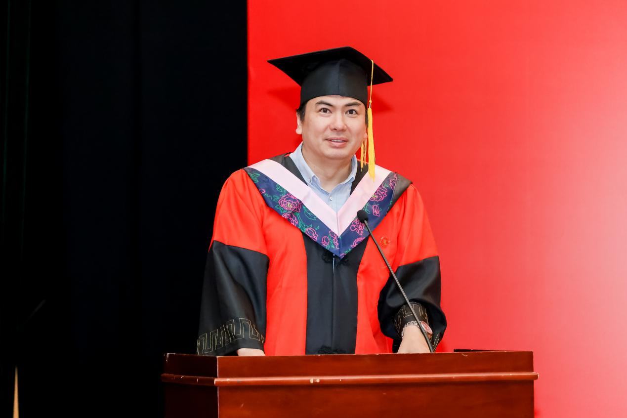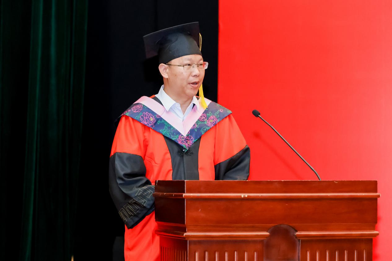 仪式在庄严肃穆的国歌声中正式拉开帷幕。德赢vwin官方入口院长兼MBA教育中心主任林嵩教授为典礼致辞,表达了对毕业生同学们的殷切期待和真挚祝福。林院长回顾过去几年学院在教学科研和人才培养工作取得的成效,充分肯定了商学学子的实力与风采。林院长对毕业生们提出三点殷切期望:一是学以致用,真正将管理学理论运用到实际工作中;二是敢于拼搏,到广阔的天地去开拓创新,成为引领时代变革的先锋;三是胸怀天下,用商业力量解决社会问题,推动社会发展,勇于承担时代的重任。最后,林院长深情寄语毕业生们,常回德赢vwin官方入口看看,并衷心祝愿他们未来充满无限可能,前程似锦。