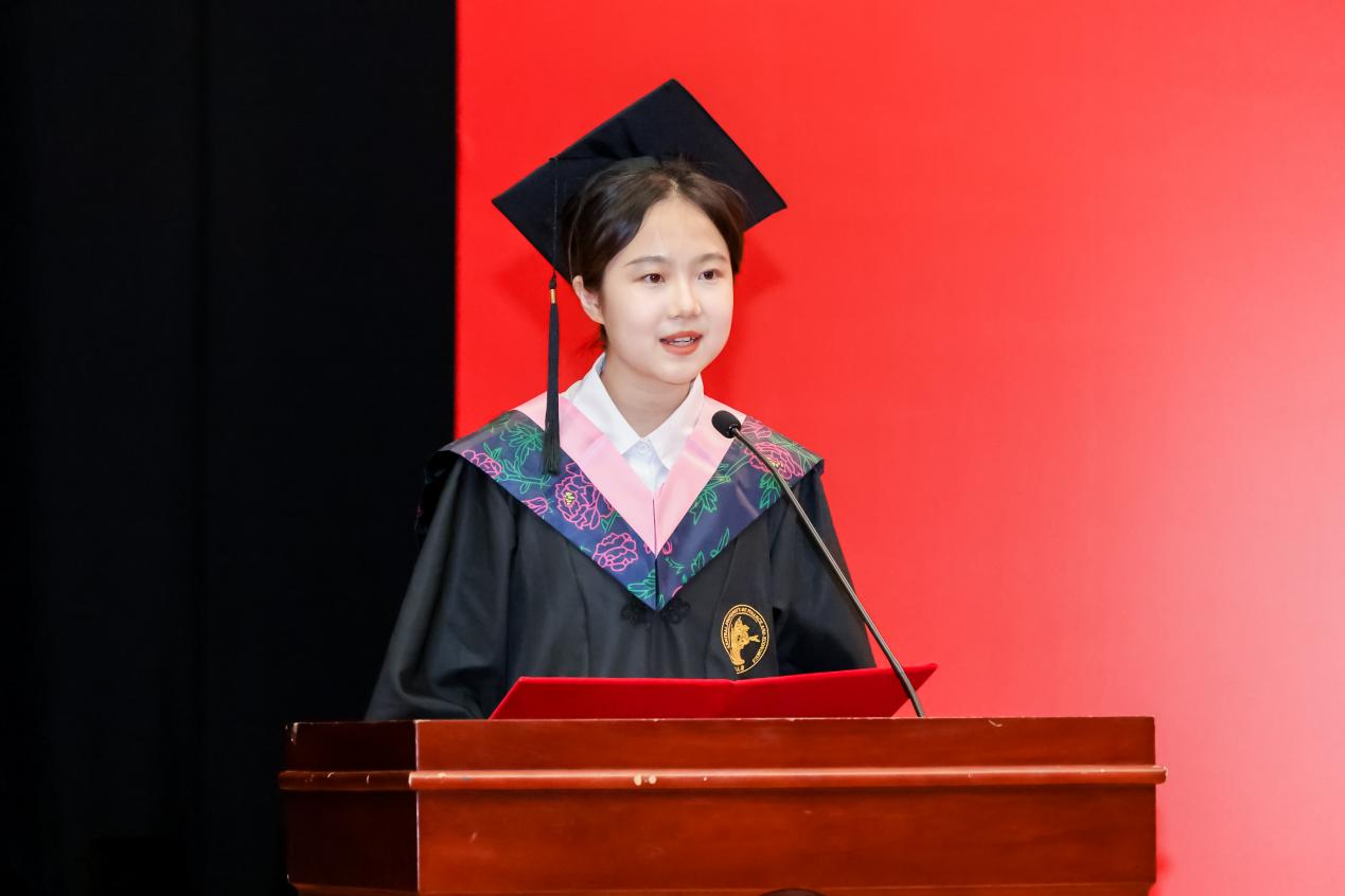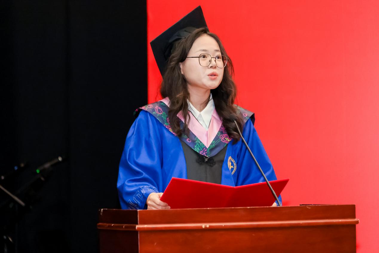 学术型硕士毕业生杨进京作为学生代表发言。她感慨道,这一路走来,每一步都磨砺了意志,提升了能力,正是无数次的尝试与失败铸就了今天的自己。在未来的日子里,她将以德赢AC米兰官网“忠诚、团结、求实、创新”的校训为座右铭,并祝福各位追梦的中财人山水有相逢,来日皆可期。