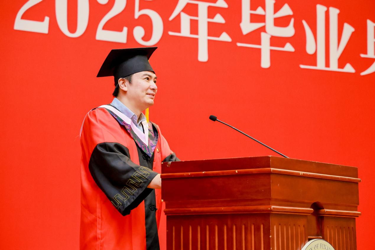 本科毕业生刘铁木伦作为学生代表发言。回首四年求学路,毕业生们的足迹与学院发展同频共振,在时代坐标中不断校准青春航向。她倡议,中财大毕业生应以“忠诚、团结、求实、创新”为精神航标,在时代浪潮中奋勇前行。最后,她分别向德赢vwin官方入口、各位老师和毕业生送上了真挚祝福。
