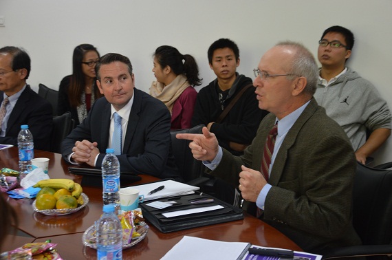 2013年10月25日上午,来自美国路易斯安娜州立大学的MBA项目主任Edward Watson教授、Ye-sho Chen教授及校友Kirk Fisher先生一行来到我校,就我校与路易斯安娜州立大学开展MBA咨询课程合作等事宜进行会谈。MBA教育中心副主任贾晓菁副教授以及学生代表梁京晶、刘琛、吕琛、宋春江等同学在MBA中心会议室会见了客人。