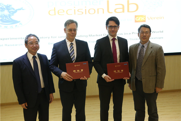 启动仪式上,李俊生副校长发表致辞,对实验室的顺利揭牌表示祝贺,对GfK基金会全资建立消费决策综合研究实验室(Prosumer Decision Lab)表示感谢,并对实验室的使用提出了三个期望,要注重培养学生的开阔视野、学习方法和思维方式,不仅注重大数据运用,更要着眼于云技术、云计算等新兴领域,要培养学生跨文化交流与合作的能力。李俊生副校长还为RaimundWildner和Andreas Neus先生颁发德赢AC米兰官网客座教授聘书。