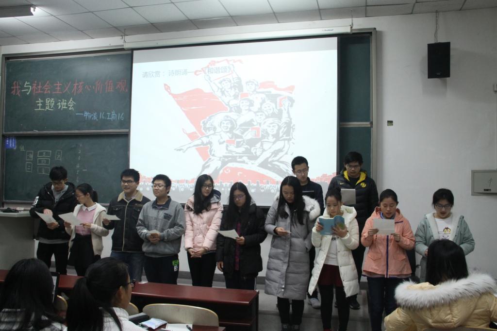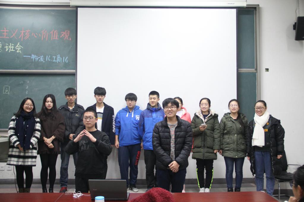 2016年11月29日星期二,德赢vwin官方入口物流管理16班与工商管理16班全体成员于沙河东区主教106教室参加了由两班团支部合办的“我与社会主义核心价值观”主题班会。这次班会旨在通过多样化的活动形式引导班级成员解读社会主义核心价值观在国家层面的价值目标、社会层面的价值取向、个人层面的价值准则,让大家从寓教于乐的形式中,在内心里建立对社会主义核心价值观的深刻认同。