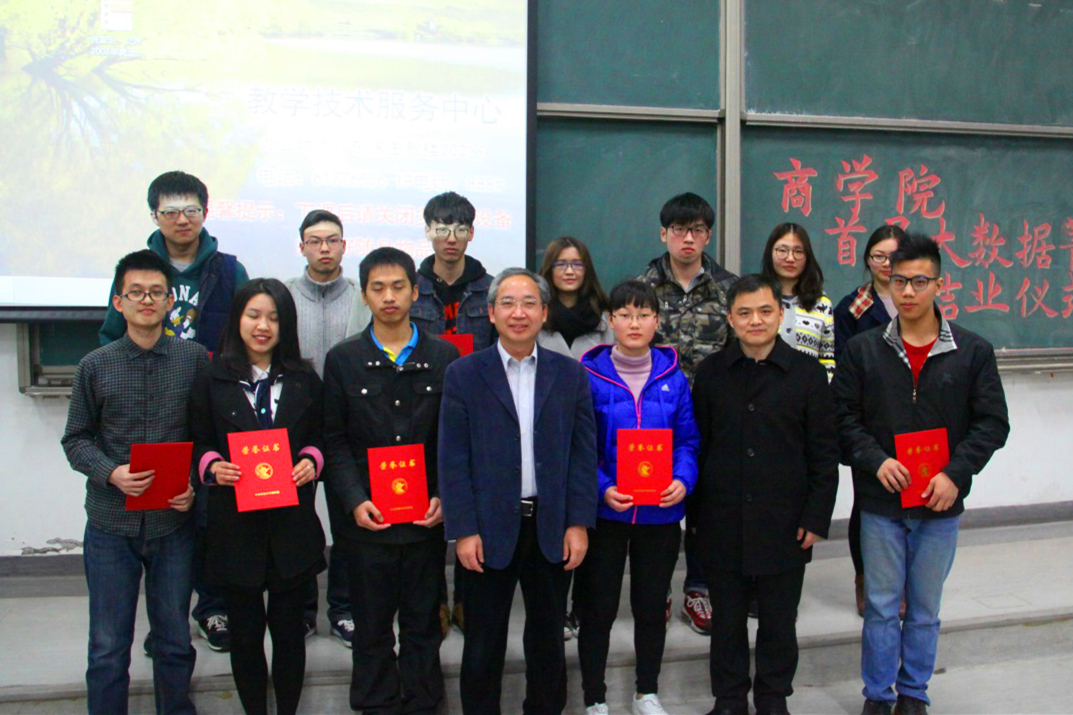 首届“大数据菁英班”共有来自德赢vwin官方入口及社会发展等学院的88名同学。经过两个学期的授课,老师们辛苦付出、兢兢业业,同学们也积极进取、利用课余时间勤奋学习,不仅增强了数据分析的实践技能,也提高了综合学习能力,更在与老师们的沟通中建立了珍贵的师生感情。经过严格的考核,首届菁英班共58位同学通过了考核顺利结业,其中15位同学因表现优异、成绩突出而荣获“大数据菁英”称号。