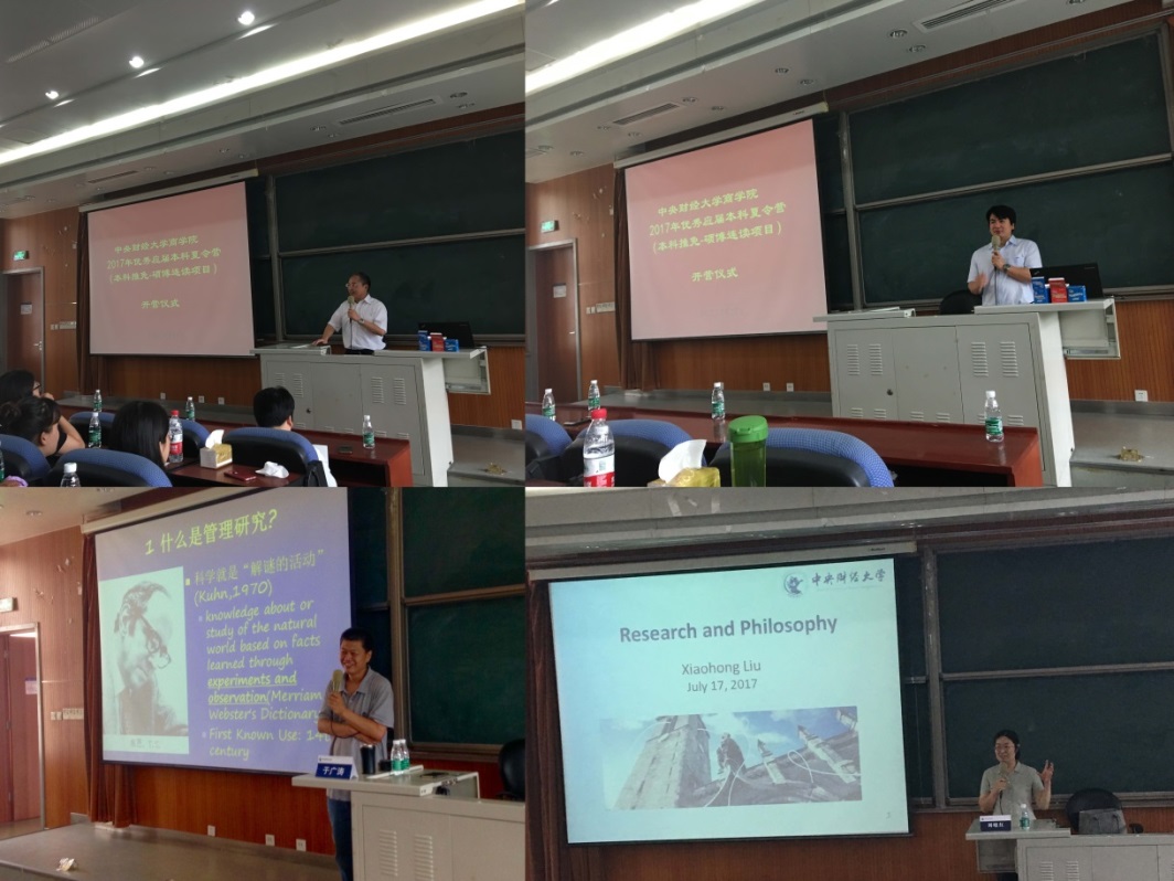 17日上午九点,夏令营开营仪式在3号学院楼222教室举行,德赢vwin官方入口院长王瑞华教授、副院长林嵩教授、研究生工作办公室主任卫昭慧老师和2016级硕博连读生代表李宇萍、孙俊萍、张茹茹、张晓彩出席了开营仪式。仪式上,王瑞华院长首先代表学院对各位营员的到来表示热烈欢迎,然后向营员介绍了德赢AC米兰官网的基本情况以及德赢vwin官方入口的历史传承、学科建设、研究生培养等情况,并祝愿营员们在德赢vwin官方入口度过充实快乐的夏令营生活。之后,卫昭慧老师详细介绍了德赢vwin官方入口的硕博连读生培养过程管理及本次夏令营的活动安排。然后,林嵩副院长向营员介绍了德赢vwin官方入口的博士生导师的学科专业、研究现状和招生期待,使营员对导师有了初步的了解。最后李宇萍同学作为代表向营员介绍了自己一年以来的硕博连读生学习和科研情况。17日下午,于广涛教授和刘晓红教授分别以“中国管理现象与中国管理研究——以家长式领导研究为例”和“研究和哲学”为题,为营员带来两场精彩的学术讲座,营员们被德赢vwin官方入口浓厚的学术氛围所感染,也为德赢vwin官方入口导师们的学术素养所折服。