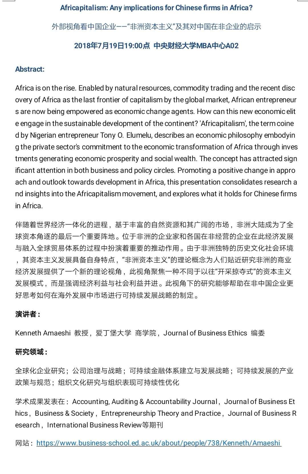 Kenneth Amaeshi教授在德赢vwin官方入口MBA中心进行了一场题为“Africapitalism as Patriotic ntrepreneurship: Any Implications for Chinese Firms in Africa”的学术演讲。演讲中Kenneth Amaeshi教授从政治经济学视角对非洲国家的市场经济和制度环境进行了剖析,并提出当地爱国主义企业家应该扮演的积极作用,最后,Amaeshi教授从非洲视角对在非的中国企业提出管理与发展建议。