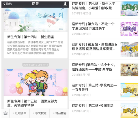 借助“中财德赢vwin官方入口”、“中财MBA”、“商音”微博微信等新媒体网络载体,德赢vwin官方入口为新生提供了温馨的咨询服务,开展了以#这个七夕.刚好遇见你#、#以心迎新#、#新生图鉴#等为主题的微迎新,以#商院专列#为特色的微信迎新系列活动,发布了详细周到的报到攻略、新生须知、防骗指南、困难帮扶等信息;MBA创新开展了迎新视频直播活动,充分展现了我院文化迎新、特色迎新的风采。