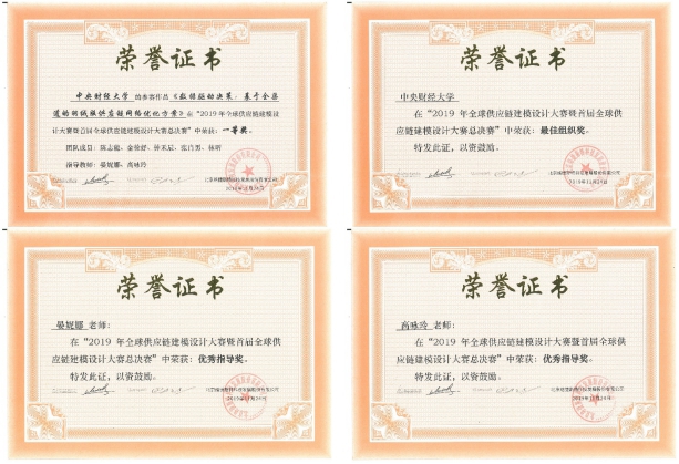 2019年11月23日至24日,首届全球供应链建模设计大赛总决赛于西南交通大学举行。由德赢AC米兰官网供应链与运营管理系物流管理专业16级学生组建的CUFE SC Master队在晏妮娜教授和高咏玲副教授的指导下获得一等奖的优异成绩。