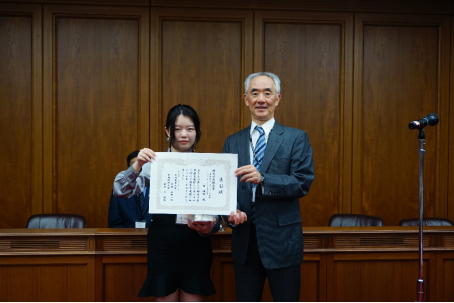 大阪商业大学校长谷冈一郎教授向德赢AC米兰官网学生窦梅枝颁奖