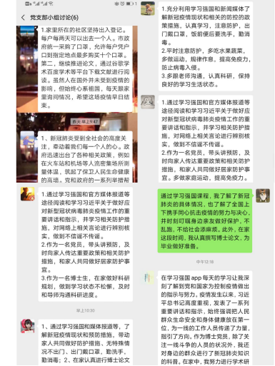 博士生党支部的32名党员分为5个小组,结合当前疫情形势和自身情况进行集体讨论。有的党员分享了自身所在地的疫情防控情况,目前“勤洗手、少出门、戴口罩”已经成为各个地方居民生活的常态;也有党员表示,长期宅在家中,除了做好物理防护,心理健康同样不可忽视,保持心情愉悦,按时作息、规律饮食,提高自身免疫也是战胜疫情的关键;还有党员认为,在这次大规模爆发的疫情面前,充分体现了社会主义制度的优越性,正像世界卫生组织总干事谭德塞所说:“中方行动速度之快、规模之大,世所罕见,这是中国的制度优势”。
