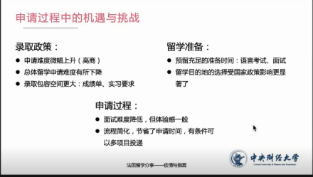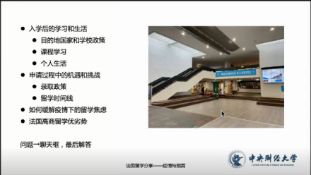 在本次讲座中,张帆校友从入学后的学习和生活、申请过程中的机遇和挑战、如何缓解疫情下的留学焦虑和法国高商留学的优劣势四个方面为大家进行讲解。
