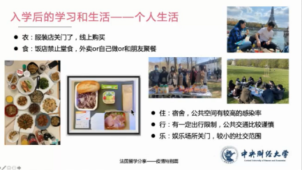 张帆校友从三方面介绍留学期间的学习和生活。首先,他对留学国家和学校的防疫政策进行简要说明。其次,张帆校友对于大家普遍关心的课程学习方式进行了介绍,对比了线上学习的优劣势。他认为,疫情期间留学的确有一些缺点,尤其体现在线上教学方面。但是线上环节也有一定的优点,如提供更快捷的合作模式、充足的空闲时间、更丰富的教学资源等。随后,张帆校友就个人生活的“衣”“食”“住”“行”“乐”五个方面进行了分享,为大家详细介绍了疫情期间特殊的法国留学生活。