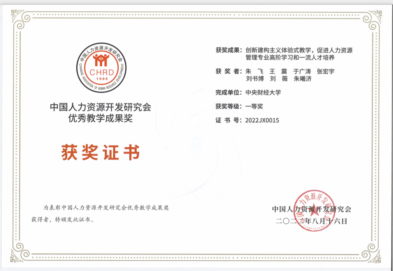 2022年8月,德赢vwin官方入口组织与人力资源管理系朱飞教授领衔的《人力资源管理》课程体系团队的教学改革成果喜获由中国人力资源开发研究会(国家一级学会,国家发展和改革委员会主管)颁发的优秀教学成果奖一等奖。该教学成果团队成员包括朱飞、王震、于广涛、张宏宇、刘书博、刘薇和朱曦济,获奖教学成果名称为《创新建构主义体验式教学,促进人力资源管理专业高阶学习和一流人才培养》。