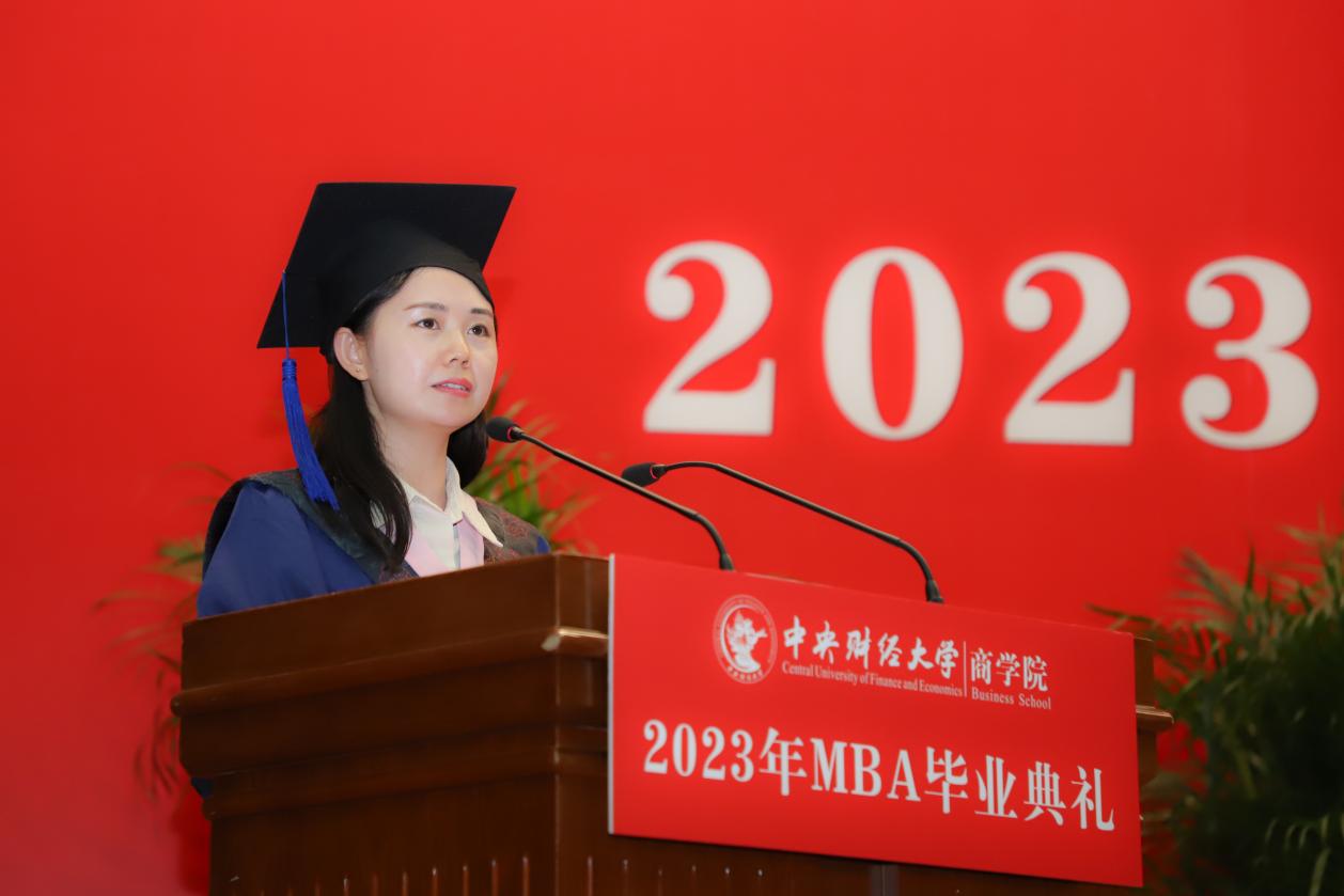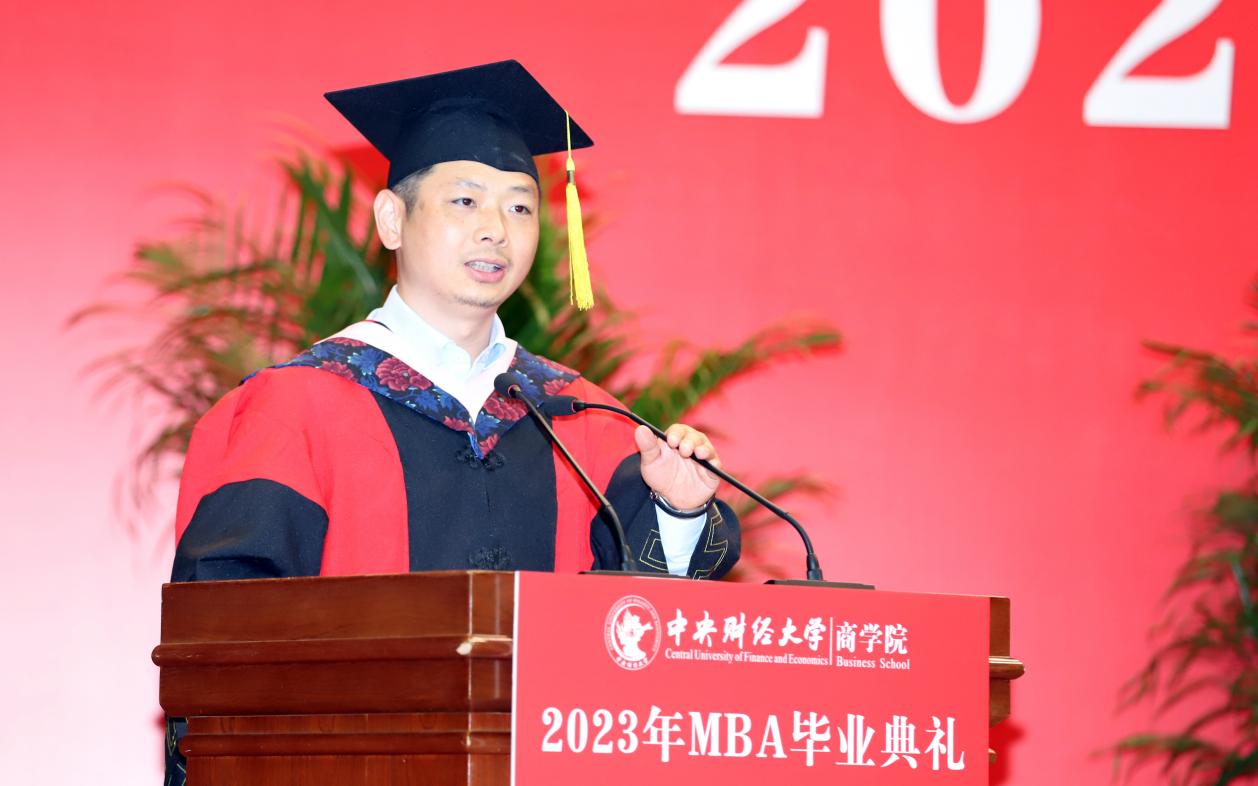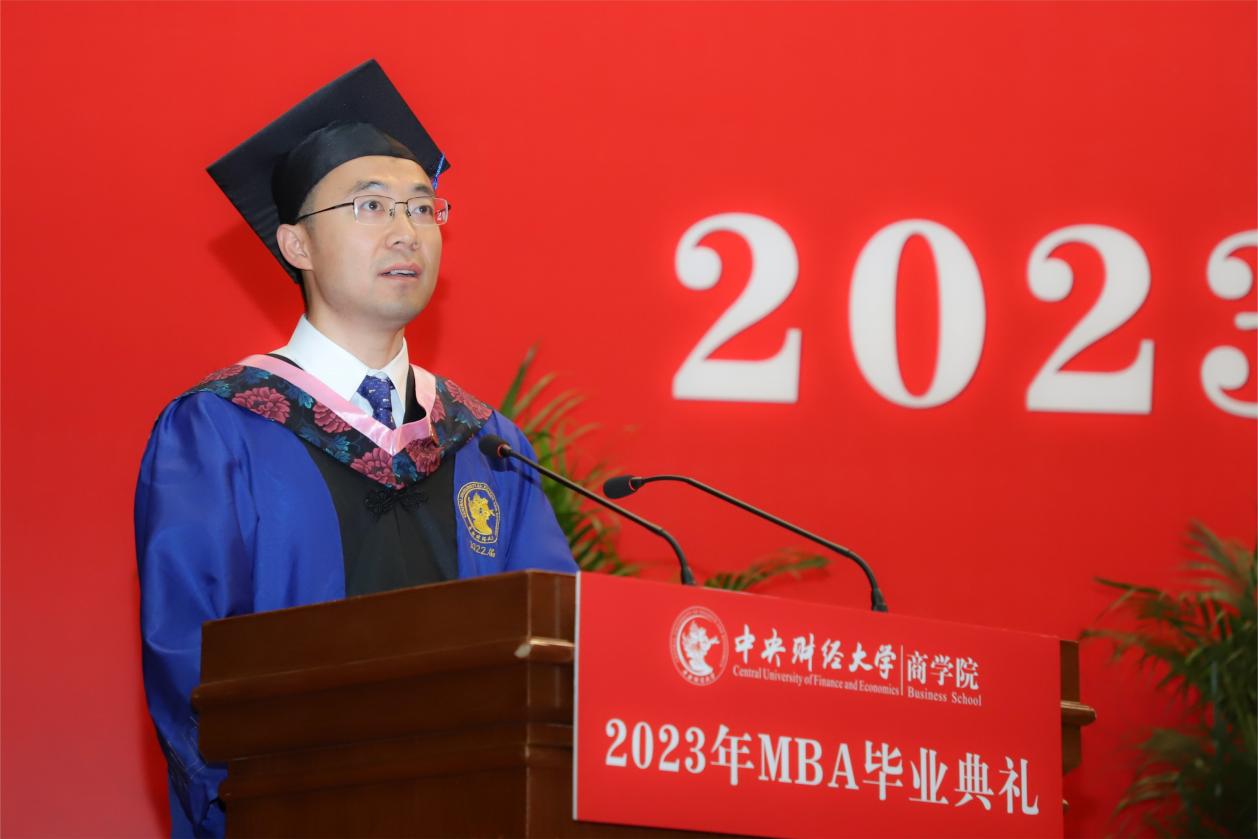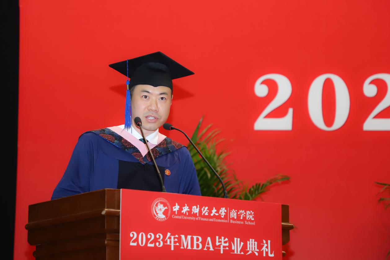 MBA任课教师于晓东作为教师代表发言,并向毕业生们献上真诚的祝福。他表示,非常高兴能代表学院全体MBA授课教师参加同学们的毕业典礼,见证大家毕业的喜悦,祝贺大家满满的收获,展望每个人美好的未来。他谈到,毕业为大家穿梭于工作岗位和学校课堂之间的辛劳和周折画上句号,也为大家开启了更高学位之下新阶段的开始和更高的目标与未来。于老师基于德赢vwin官方入口的“商”字 的架构,将对大家的期望与祝福也浓缩在一个“商”字中。“商”的上半部分的“立”,于老师引用《左传》里的“太上有立德,其次有立功,其次有立‘’,期望大家在今后的工作中和生活中,从立德到立功再到立言,都不能放松对自己的要求。“商”字的下半部分“冏”,于老师赋予了炯炯有神和代表光明的内涵,以此祝愿广大毕业生前景光明,祝愿我们的国家拥有光明的未来。