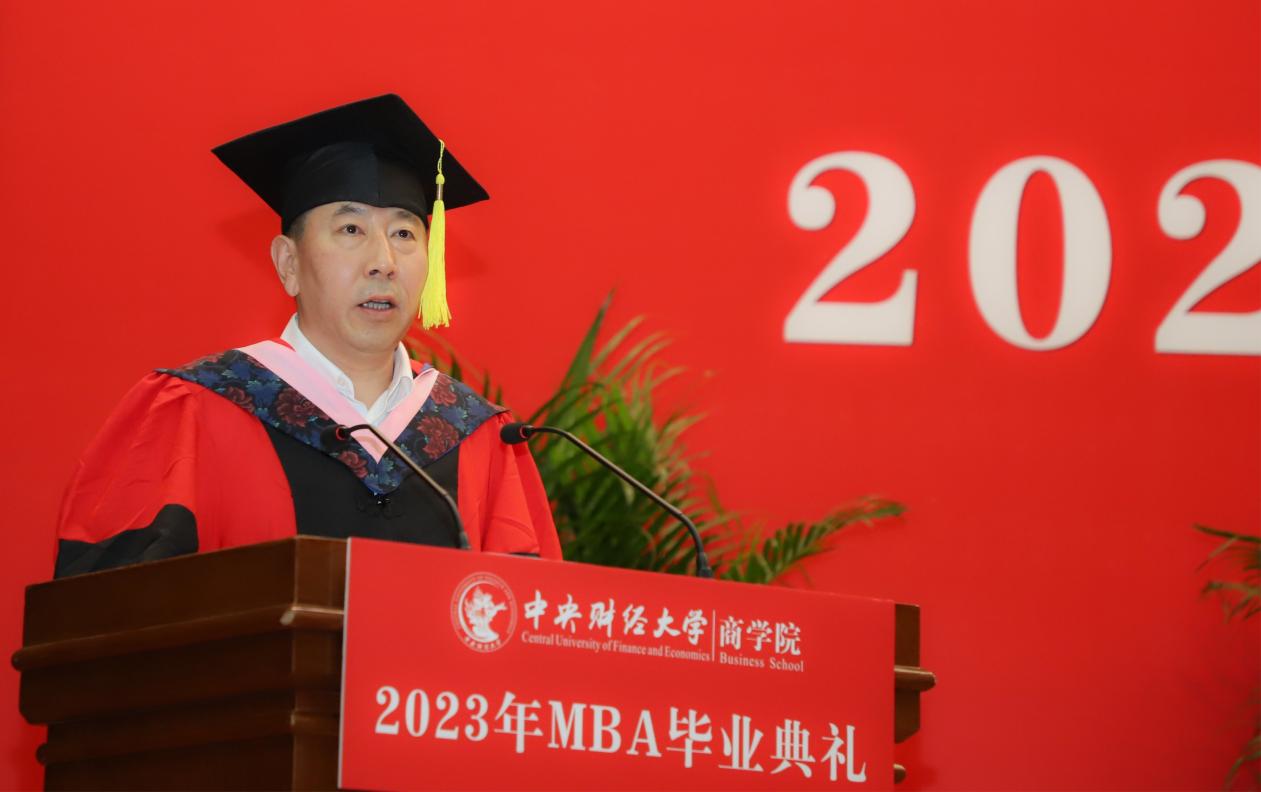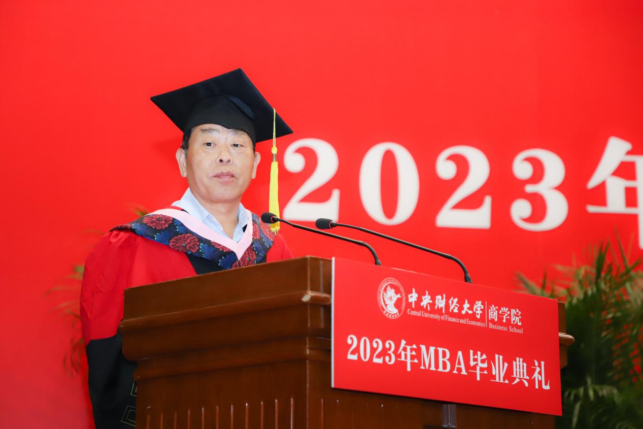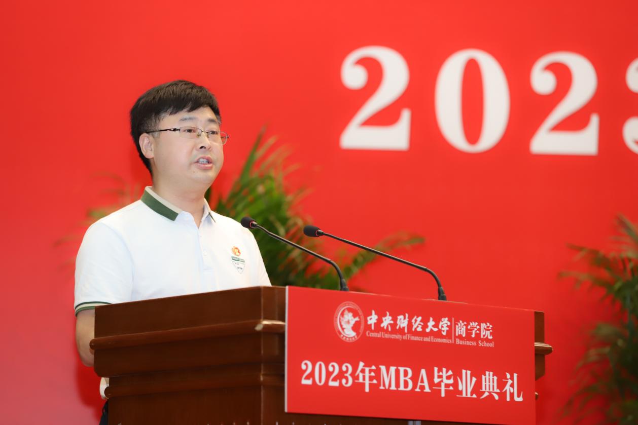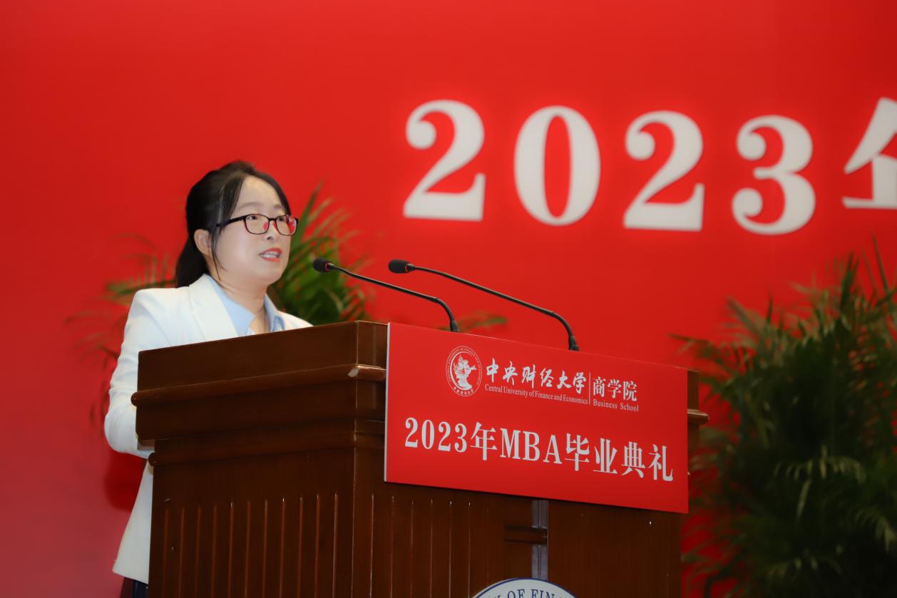 MBA任课教师于晓东作为教师代表发言,并向毕业生们献上真诚的祝福。他表示,非常高兴能代表学院全体MBA授课教师参加同学们的毕业典礼,见证大家毕业的喜悦,祝贺大家满满的收获,展望每个人美好的未来。他谈到,毕业为大家穿梭于工作岗位和学校课堂之间的辛劳和周折画上句号,也为大家开启了更高学位之下新阶段的开始和更高的目标与未来。于老师基于德赢vwin官方入口的“商”字 的架构,将对大家的期望与祝福也浓缩在一个“商”字中。“商”的上半部分的“立”,于老师引用《左传》里的“太上有立德,其次有立功,其次有立‘’,期望大家在今后的工作中和生活中,从立德到立功再到立言,都不能放松对自己的要求。“商”字的下半部分“冏”,于老师赋予了炯炯有神和代表光明的内涵,以此祝愿广大毕业生前景光明,祝愿我们的国家拥有光明的未来。