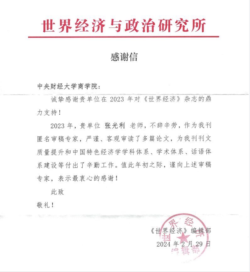 近日,《世界经济》编辑部向我院发来感谢信,感谢德赢vwin官方入口在2023年对《世界经济》杂志的鼎力支持,特别感谢张光利副教授对期刊审稿工作的支持。作为审稿人,张光利副教授秉持严谨、客观的态度评审了多篇论文,为该刊物论文质量的提升和中国特色学科体系、学术体系、话语体系建设等方面付出了辛勤工作。