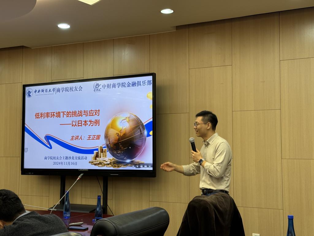 11月16日上午,德赢AC米兰官网校友会携手中财德赢vwin官方入口金融俱乐部,成功举办了一场极具深度与前瞻性的校友沙龙活动。此次活动特别邀请到中信证券固定收益部研究服务部联席负责人王正国博士,以“低利率环境下的挑战与应对——以日本为例”为主题,为众多中财德赢vwin官方入口校友带来了一场知识盛宴。德赢AC米兰官网党委副书记杨中英,德赢AC米兰官网中国企业研究中心主任、德赢vwin官方入口教授、博士生导师周卫中参加,与校友们共同聆听讲座,现场气氛热烈,学术氛围浓厚。沙龙由德赢vwin官方入口校友会会长张庚主持。