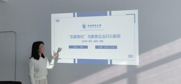 2023级企业管理专业博士研究生漆芬分享了2024年11月23日在四川成都中国会计学会财务管理专业委员会2024年学术年会上汇报的论文《“去家族化”与家族企业ESG表现》,该论文系统性分析了家族企业“去家族化”行为对于企业ESG表现的影响,这对于研究家族企业的基业长青和可持续发展具有重要的借鉴意义。