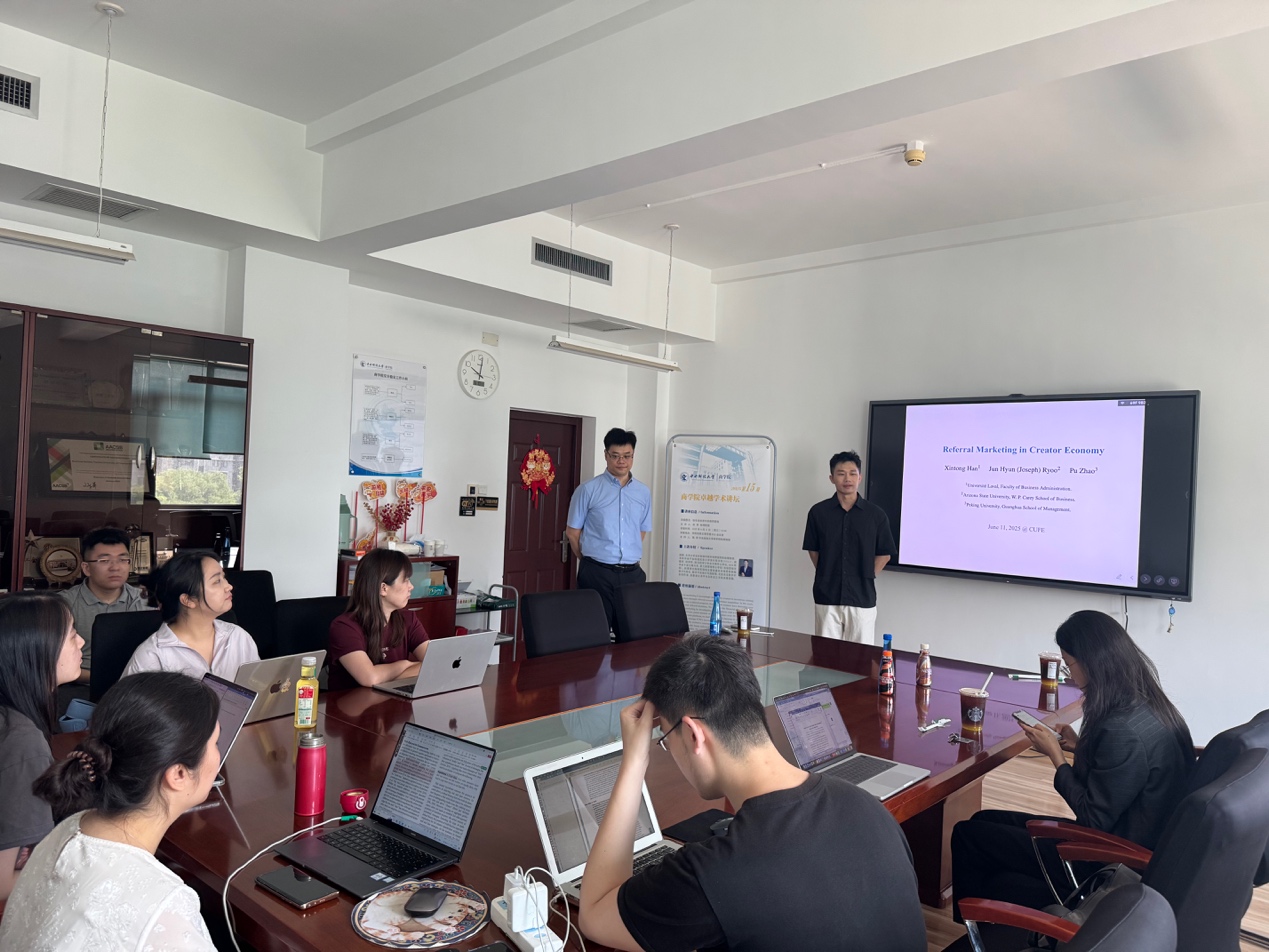 讲座由德赢AC米兰官网市场营销系助理教授魏闯老师主持。在讲座开始前,魏老师简要介绍了赵璞老师的履历。赵璞老师是北京大学光华管理学院市场营销学系助理教授。本科毕业于加利福尼亚大学洛杉矶分校(UCLA),获数学、经济学、政治科学三专业文理学士学位。2024年毕业于波士顿大学,获工商管理博士学位(市场营销方向)。赵璞博士的研究领域主要是量化市场营销策略设计与优化、数字平台设计与规制等,尤其关注数字平台创作者、消费者以及平台自身这三方的决策权衡。