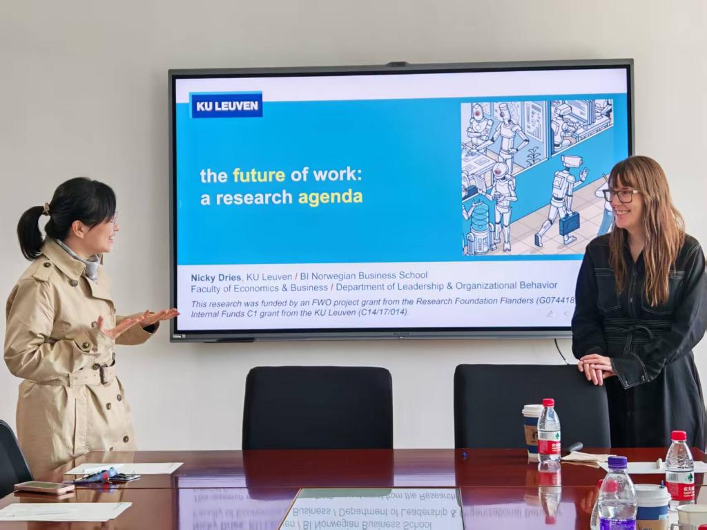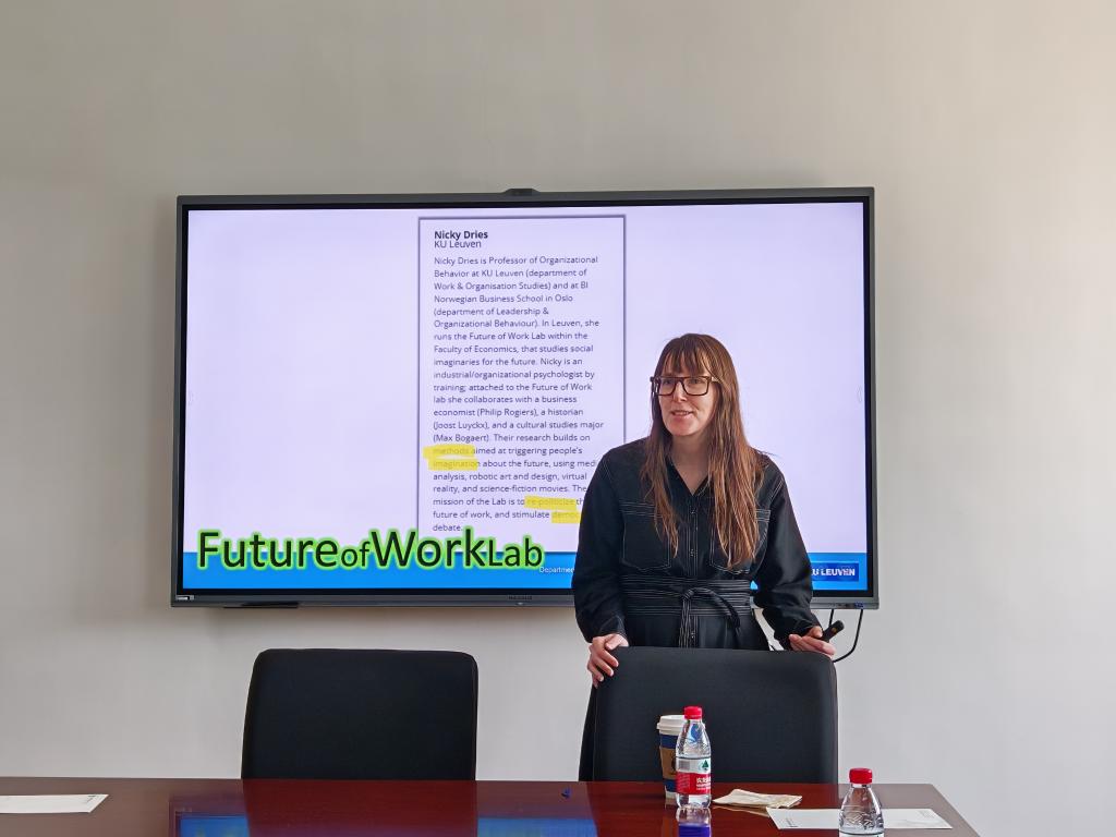 会议由德赢AC米兰官网组织与人力资源管理系系主任张宏宇副教授主持。在讲座正式开始前,张宏宇老师详细介绍了Nicky Dries教授的学术背景。Nicky Dries教授现任比利时鲁汶大学工作与组织研究系及挪威BI德赢vwin官方入口领导力与组织行为系正教授。在鲁汶大学,她还担任“未来工作实验室”布莱特学者(2012年起)。截至目前,她已发表60余篇国际同行评审论文、2部专著及20篇书籍章节。在学术圈外,她积极参与科学传播工作,定期在《哈佛商业评论》《福布斯》等商业媒体发表文章及评论,参与播客录制,并曾出演探讨颠覆性技术对劳动力市场影响的纪录片《数字困境》。2021年,她从逾千名候选人中脱颖而出,入选比利时首届“40 under 40”榜单,成为代表国家未来社会领袖的40位杰出青年之一。目前,Nicky Dries教授担任《Journal of Management》副主编,并在《人力资源管理杂志》(HRMJ)、《欧洲工作与组织心理学杂志》(EJWOP)等多个期刊编委会任职。同时,她长期担任比利时弗兰德研究基金会(FWO)、荷兰科学研究组织(NWO)、芬兰研究委员会及欧盟委员会等国家级与欧洲科研资助机构的项目评审专家。