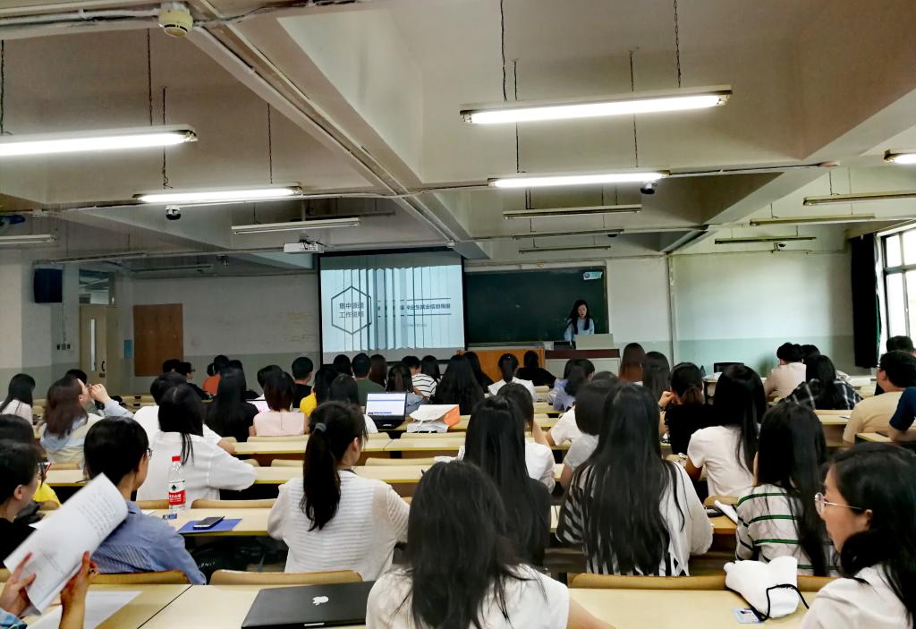 张碘老师首先就毕业派遣工作的重要性进行了强调说明。随后,2017级学术型硕士研究生班班长陈金然同学向同学们传达了学校就业指导中心集中派遣工作培训会的相关内容,为大家详细讲解了国内升学、出国(境)留学和就业三种毕业派遣的工作流程和填写要求,具体包括集中派遣的报到证、户口迁移证等关键词解释,不同就业形式的派遣细则,以及时间安排、提交材料注意事项等。