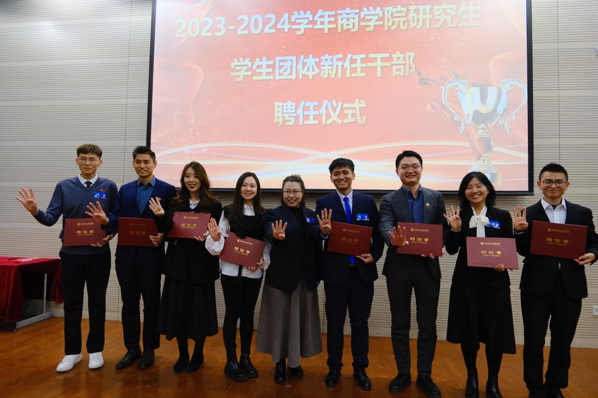 德赢vwin官方入口党委副书记杨中英为MBA社团协会秘书长郭子瑶、副秘书长陈炼、刘明华、孔一婕、孟庆玮颁发聘任书。
