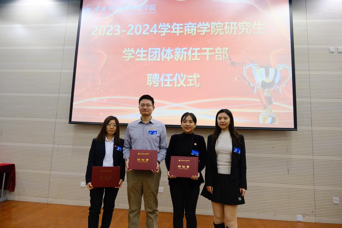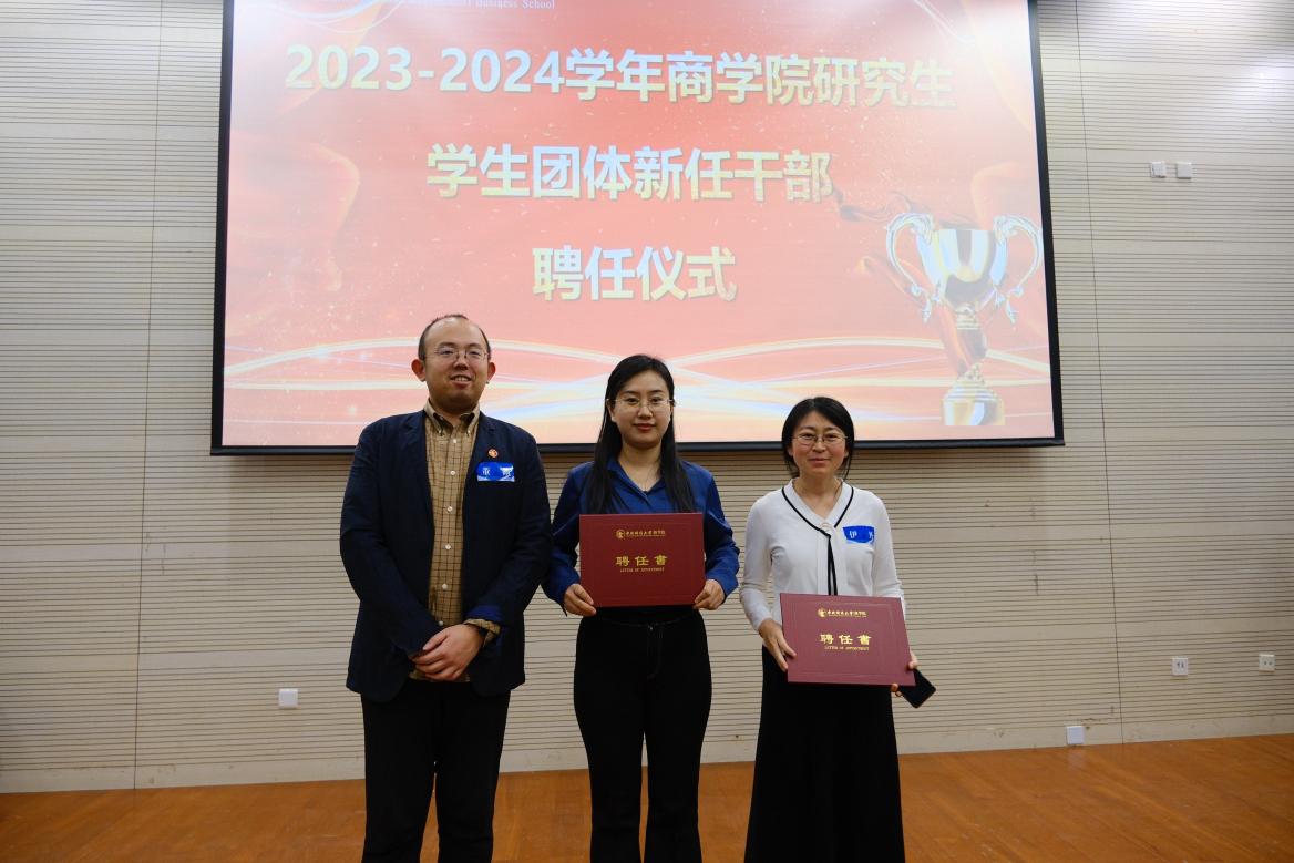 德赢vwin官方入口党委副书记杨中英、MBA教育中心副主任兼德赢vwin官方入口副院长朱飞为第二十届MBA联合会主席刘明华、秘书长孔一婕颁发聘书。