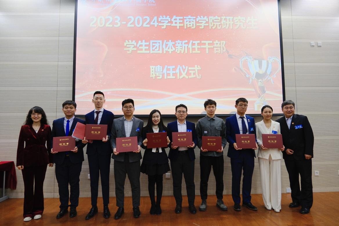 大会上,德赢vwin官方入口党委书记李跃新、副书记杨中英、MBA教育中心副主任兼德赢vwin官方入口副院长朱飞、出席会议的各位老师以及各学生团体负责人为2023-2024学年德赢vwin官方入口研究生学生团体新任干部颁发了聘书。