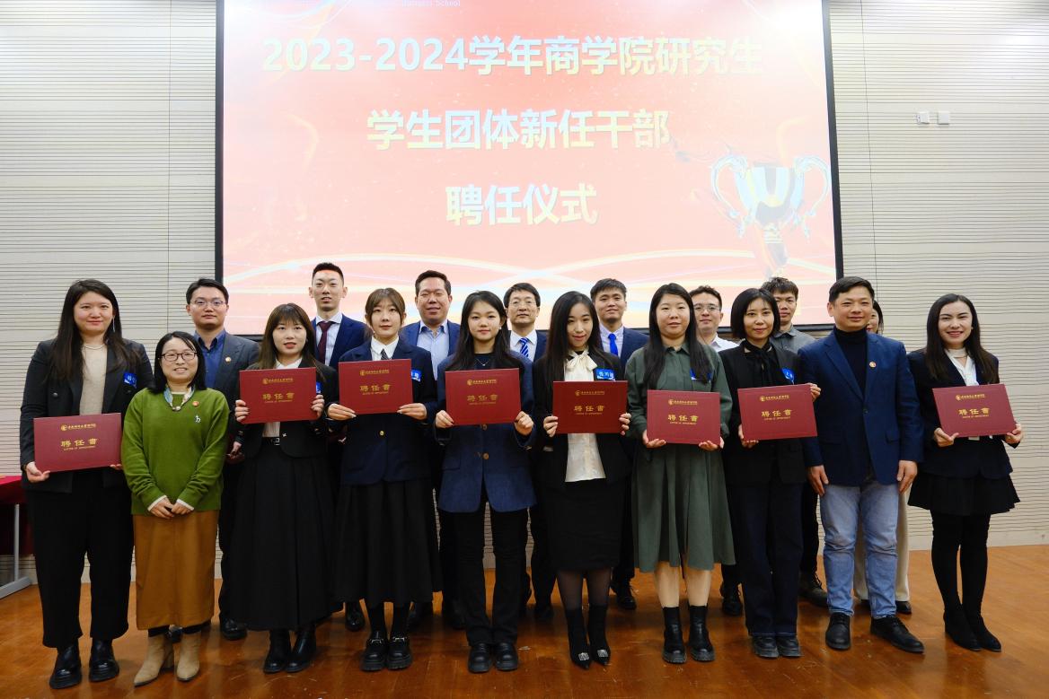 MBA学生工作部刘欣锋老师为房地产俱乐部执行主席22级吴红蕾、秘书长22级王尊、执行秘书长23级孟庆玮、副秘书长23级任茗聪、郑涵之、杨淞严、金麒;执行部长23级胡霖、李超、邵丽娜、张会延、张凯、周玉倩颁发聘书。