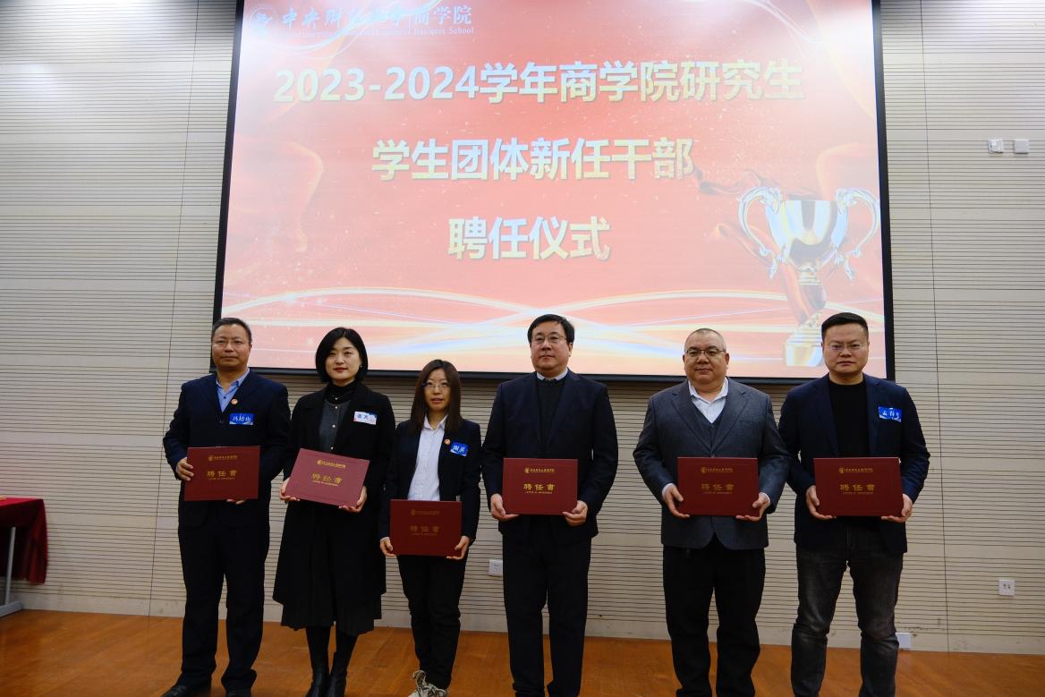 MBA学生工作部曾功星老师、文体协会会长邱滢霏、执行会长张树涛为新任委员20级王成成、21级袁帅、21级胡新华、22级吴红蕾、22级刘畅、22级李金龙颁发聘书。