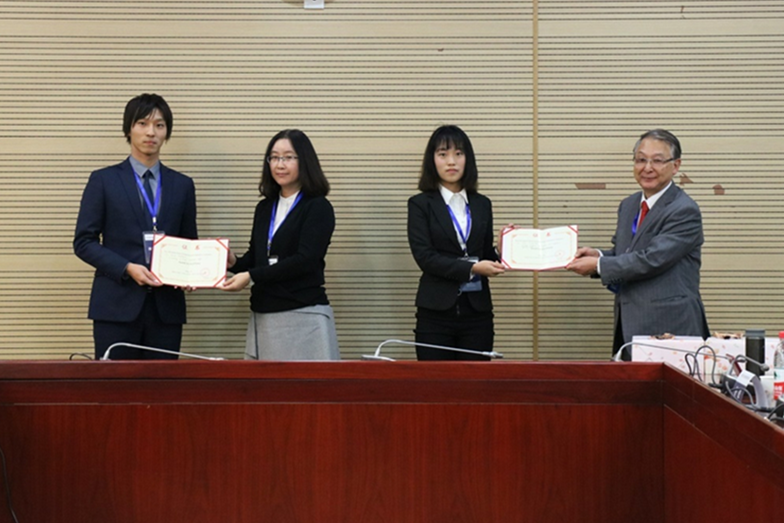 第二环节结束后,与会评委对学生展示进行了点评,德赢AC米兰官网戴晓天的《3D printing cloud classroom》和大阪商业大学藤川功基的《日本纸》获得本次国际交流会的最佳展示奖,安室宪一教授和葛建新教授分别对获奖同学颁发了证书。整个会议由中方周卫中教授、柴庆春副教授,日方孙飞舟教授、阎和平教授全程翻译。