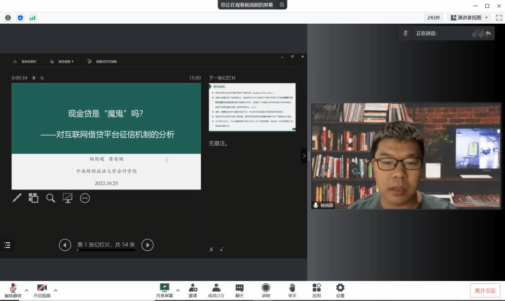 At 3:00 p.m., October 25, 2022, the Business School of Central University of Finance and Economics (CUFE) held the 14th Session of the Excellent Academic Forum Lecture Series online through Tencent Meeting. Professor Yang Guochao from the School of Accounting of the Zhongnan University of Economics and Law was invited as the keynote speaker of this lecture, and more than 50 people (including teachers, master and doctoral students, and undergraduate students) attended this lecture.