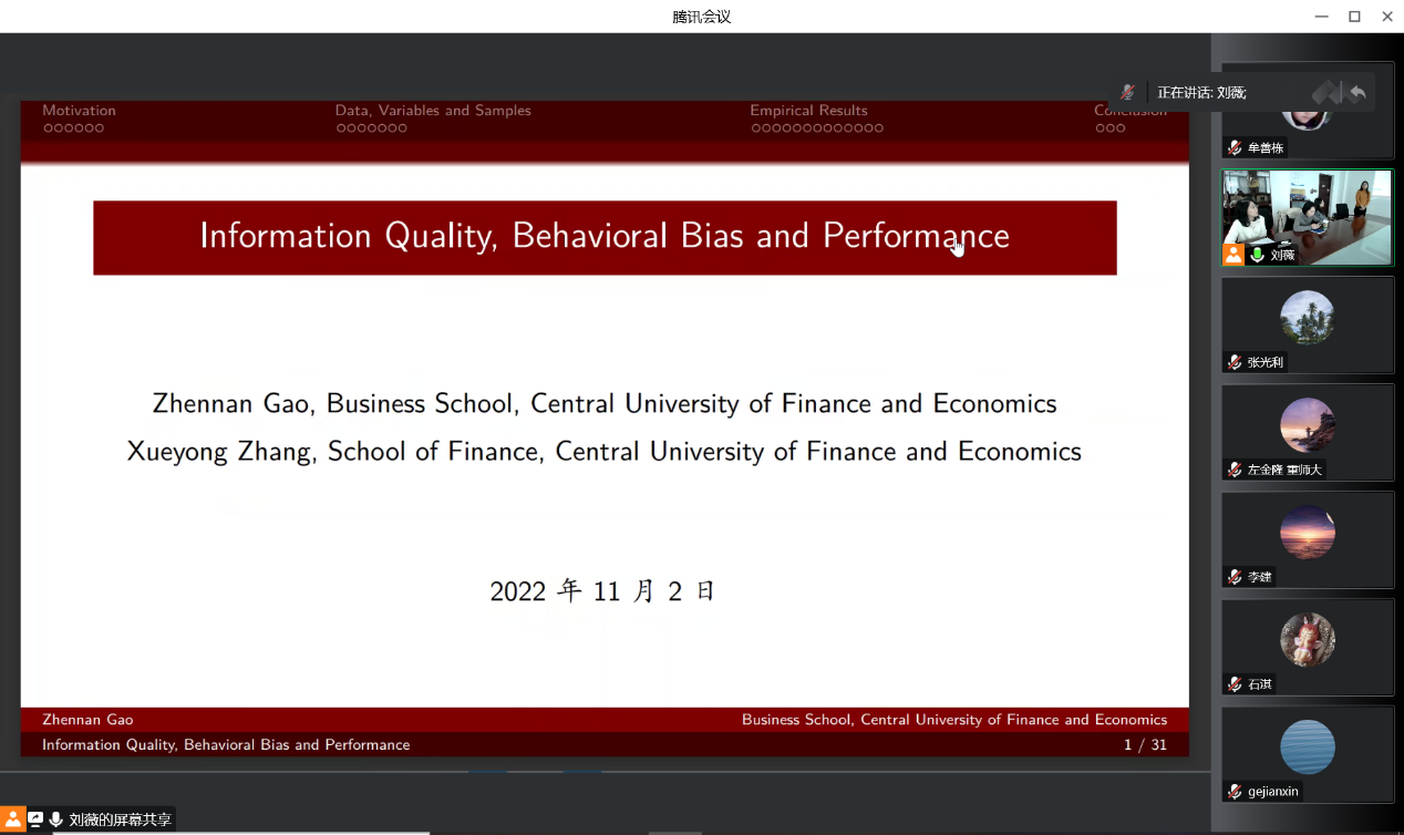 At 11:00 p.m., November 2, 2022, the Business School of Central University of Finance and Economics (CUFE) held the 15th Session of the Business School’s Excellent Academic Forum Lecture Series in 2022 through online Tencent Meeting and offline meeting venues. Dr. Gao Zhennan from the Department of Finance and Financial Management of the Business School of Central University of Finance and Economics was invited as the keynote speaker of this lecture, and more than 30 people (including teachers, master and doctoral students, and undergraduate students) attended this lecture.