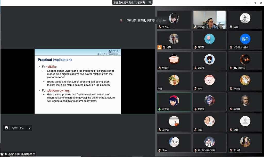 Professor Li Jiatao first introduced the special issue topics in JIBS to the teachers and students of the Business School, and shared his opinions with them in combination with the paper topic “Digital Platforms as a Channel to Enter Foreign Markets: Overcoming the Liabilities of Foreignness and Complementorship”. This research adopts the data of Amazon.com and JD.com, i.e. the leading e-commerce platforms in the United States and China. The research results confirm that: in comparison with the condition that the supplier serves as a platform owner, the sales will be lower if the supplier maintains control through selling as a third-party seller. Besides, the research findings suggest that the penalty for retaining control will be smaller for companies with stronger brands, and those companies whose consumers prefer digital business models. These findings provide new insights into how multinational companies leverage digital platform channels to enter foreign markets.