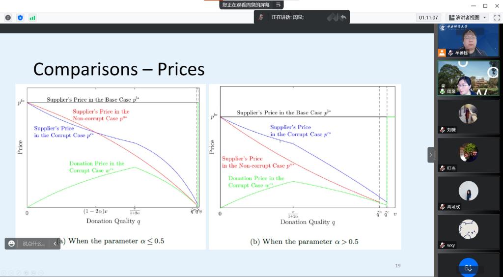The topic of Dr. Zhou Quan’s lecture is “Modeling the Effects of Dated Medical Supplies Donation on Recipient Countries”. The research focuses on the donation of dated medical supplies. The international community has always been very cautious about such issues, and most of the concerns lie in the macro influence on recipient countries. This research focuses on the donation of personal protective equipment and similar products, because these products have lower risks related to aging and safety. With a given degree of security, this research simulates the incentive problems in the supply chain of donation of medical supplies, and predicts the potential consequences of corruption in these donations and their impact on local industries. The research findings show that the impact of these donations is not monotonically related to the quality of the donations. Thus, the international community is recommended to reconsider its position of prohibiting the donation of dated supplies. In addition, Dr. Zhou Quan shared valuable experience and suggestions on how to publish papers in authoritative journals during the paper submission process.