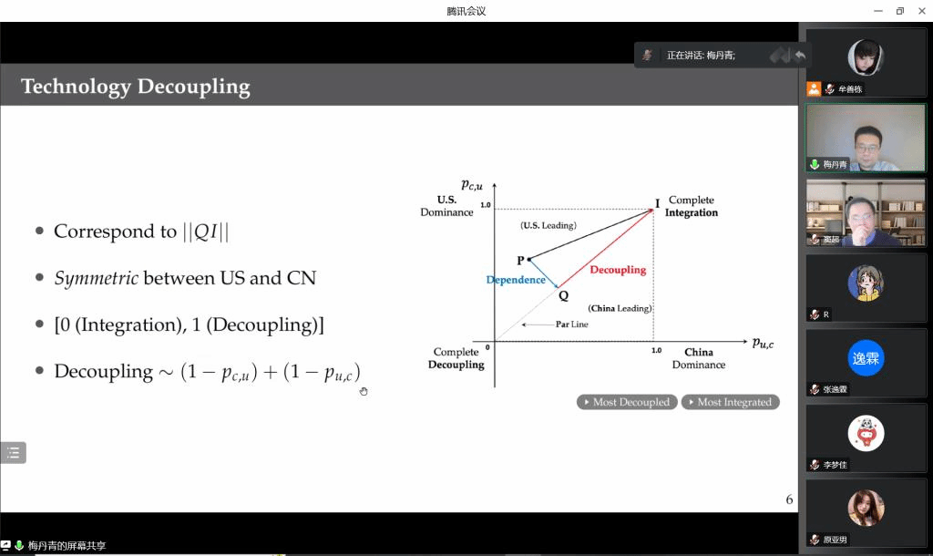 The topic of the lecture delivered by Dr. Mei Danqing is “Mapping U.S. - China Technology Decoupling: Policies, Innovation and Firm Performance”. In this research, the measures of technological decoupling and dependence between the United States and China are constructed on the basis of the merged patent data. The first two decades of this century witnessed a steady growth in technology integration (or less decoupling), but in the first (second) decade, China's dependence on the United States increased (decreased). The companies protected by China's policies for emerging industries of strategic importance were less decoupled from the United States and got cash flow and valuation, but without improvements in innovation output/quality or productivity. After the US sanctions, the sanctioned industries and their downstream companies performed poorly, but the degree of decoupling from the US also decreased. However, the companies in the upper reaches of the sanctioned sectors have significantly improved their productivity and produced more breakthroughs and better quality innovation explorations.
