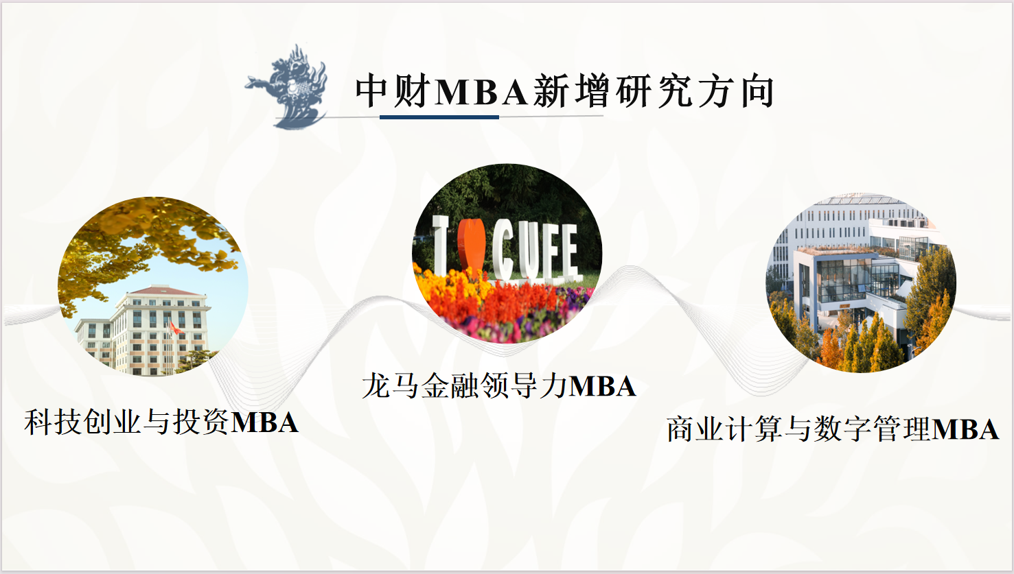 In the face of the economy stepping into the new normal, new technological changes, globalization and reverse globalization, deep changes in the financial industry and the tide of technology entrepreneurship, the CUFE MBA program kept up with the times, and intended to officially launch three cutting-edge major directions in the class of 2025, i.e.LongmaFinancial Leadership, Technological Entrepreneurship and Investment, and Business Computing & Digital Management. The establishment of these three major directions was not only an action to meet the development needs of the CUFE MBA project, but also a positive response to the national development strategy of "Digital China".