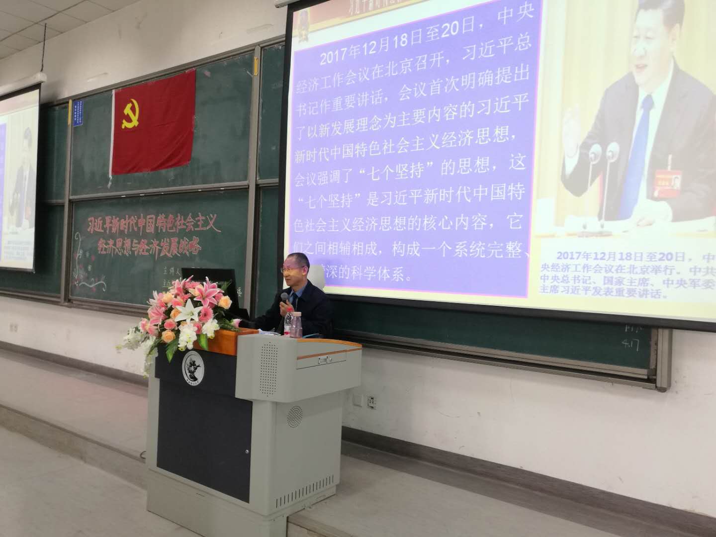 讲座伊始,张军果教授介绍了习近平新时代中国特色社会主义经济思想的科学内涵。他指出,“七个坚持”是习近平新时代中国特色社会主义经济思想的核心内容,它们之间相辅相成,构成一个系统完整、博大精深的科学体系。张军果教授详细阐述了“七个坚持”的内容体系,第一,坚持加强党对经济工作的集中统一领导;第二,坚持以人民为中心的发展思想;第三,坚持适应把握引领经济发展新常态;第四,坚持使市场在资源配置中起决定性作用;第五,坚持适应我国经济发展主要矛盾变化完善宏观调控;第六,坚持问题导向部署经济发展新战略;第七,坚持正确工作策略和方法,稳中求进,保持战略定力,坚持底线思维,一步一个脚印向前迈进。