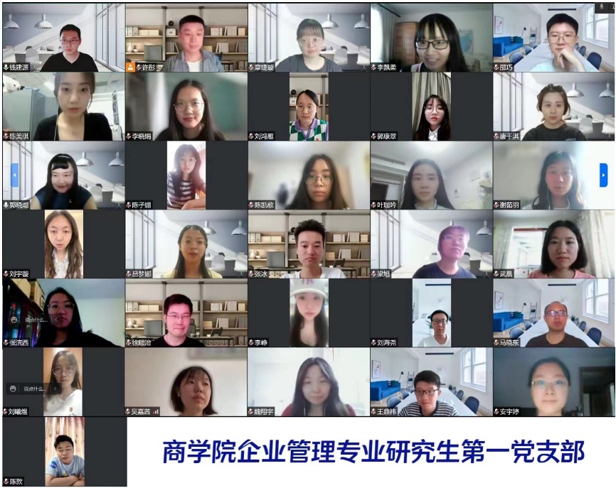 2022年6月8日,德赢vwin官方入口企业管理专业研究生第一党支部组织开展“深入学习贯彻习近平总书记给南京大学留学归国青年重要回信精神”主题党日活动。党支部23名党员、8名积极分子参加活动。活动由支部书记郭晓焜主持。