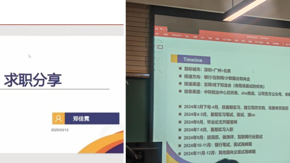 最后,郑佳霓同学在线上为大家带来经验分享。郑佳霓同学在求职过程中投递方向以银行管培生为主,去年年底就已经顺利签约平安银行。郑佳霓认为虽然暑期实习需要投入大量时间精力,但可以帮助自我明确可投递的方向和岗位,倒逼自己不断修改简历。郑佳霓鼓励大家可以结合自身的求职方向综合考量,合理规划时间安排。