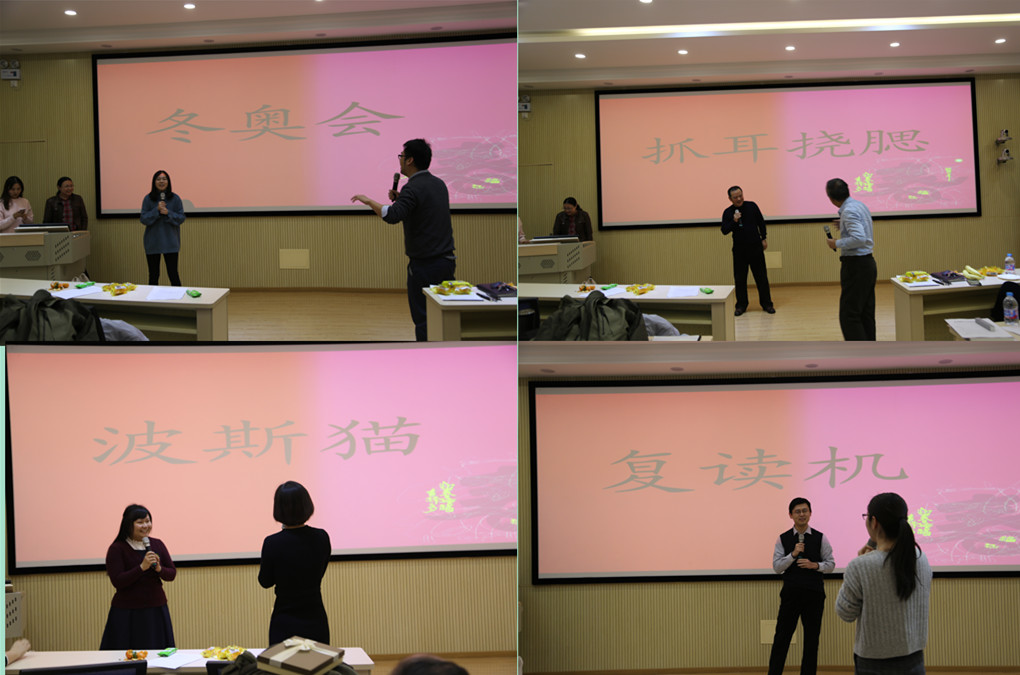人力系老师则为大家开展了一个猜词游戏,今年的流行词语、经典成语等词汇通过一位老师表演、一位老师猜词,搞笑的表演、敏捷的反应,展示了德赢vwin官方入口老师不仅具有高深的专业学识,也具备更接地气、跟上时代的网络知识。