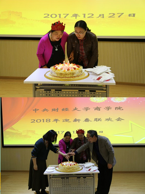 联欢活动之际,正是我院教工王志红、林琳两位老师的生日。学院特别准备生日蛋糕,全体老师在联欢会现场为两位老师祝福生日快乐,感谢两位老师一年的辛苦付出。整个晚会现场散发着暖暖的温情。