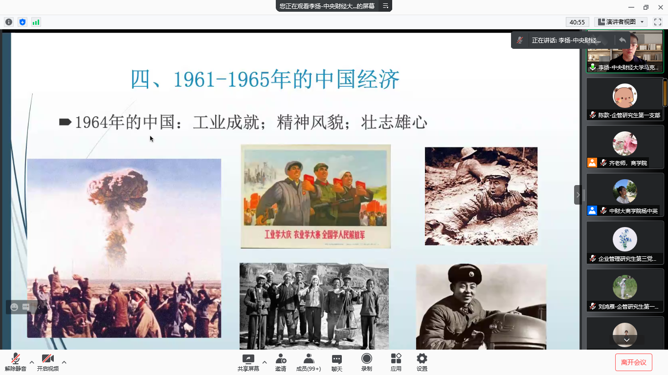 学院党委副书记杨中英做总结发言。她指出,李扬老师对中国特色社会主义经济的发展历程作了深入浅出的报告,以高度凝练的语言和生动活泼的史料讲解了发展历程中的重要时点和关键事件,总结了发展过程中迸发出来的创新做法和中国特色。她希望全体研究生党员结合四史学习,更加全面、深入地了解我国经济发展的历史,掌握规律,以史为鉴,对照现实,作为未来中国社会的管理人才,为新时代中国经济的高质量发展贡献自己的力量。