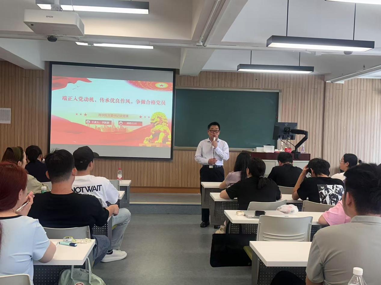 为深入贯彻中央八项规定精神学习教育,进一步加强入党积极分子的党性修养和思想教育,2025年5月15日中午,德赢vwin官方入口党委在学院南路校区主教303教室举办入党积极分子、发展对象专题党课《端正入党动机,传承优良作风,争做合格党员》。此次培训由学院党委书记李跃新主讲,党委组织员王志梅主持,党务秘书窦宗玥及入党积极分子、发展对象等115人参加。