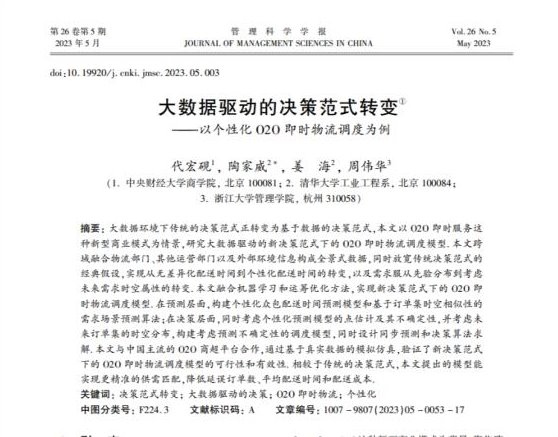 近日,我院代宏砚教授与清华大学陶家威博士、清华大学姜海教授及浙江大学周伟华教授合作撰写的《大数据驱动的决策范式转变——以个性化O2O即时物流调度为例》在权威学术期刊《管理科学学报》发表。